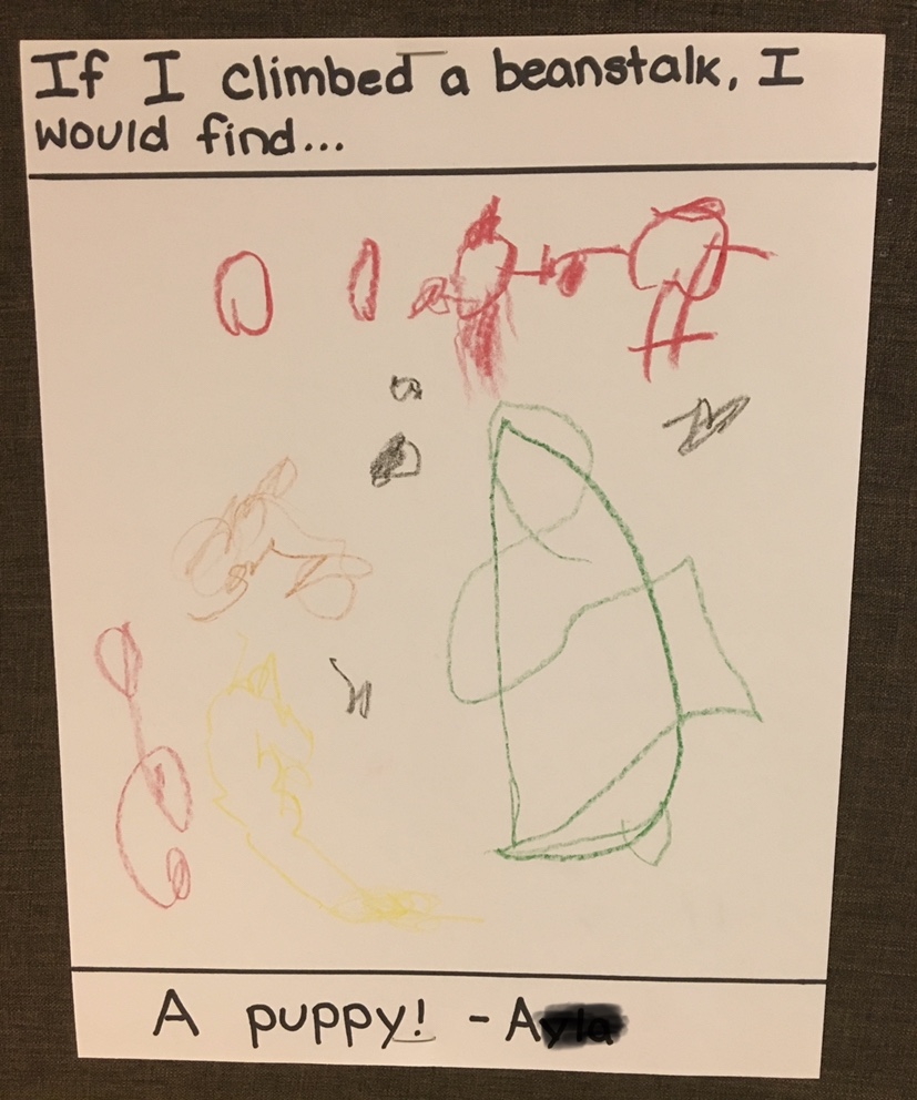 • Read Jack and the Beanstalk and think, talk, write, and/or draw about your own beanstalk! What would be at the top of it? Would you find a giant or something else? Here are some examples of student work from last year!