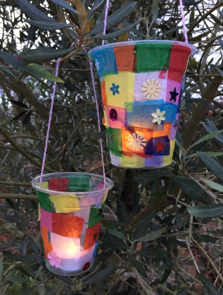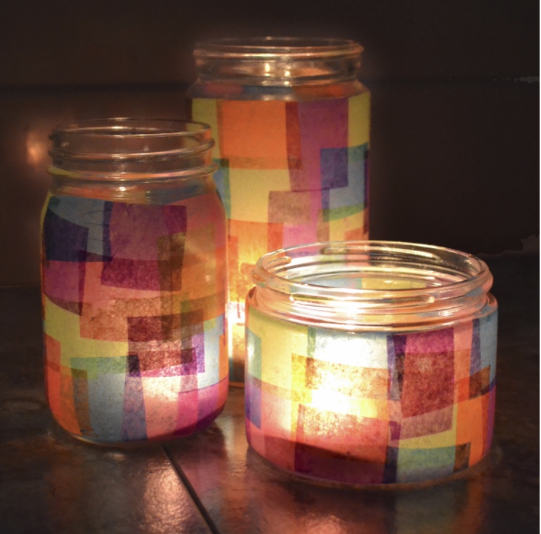 • Recycle plastic cups, glass jars, or plastic bottles by creating a lantern that you could use at your campsite!